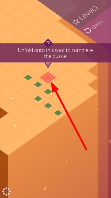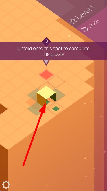 2、根据提示Unfold onto this spot to complete the puzzle,操作黄色方块,按箭头指引方向折叠,匹配目标位置。