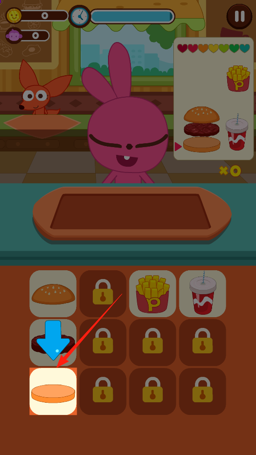 1、紫色小兔子来点餐啦,右边菜单显示它想要的食物,你看下方食材栏根据提示点对应的食材,像箭头指的这个选好就能开始做餐,给兔子上菜。