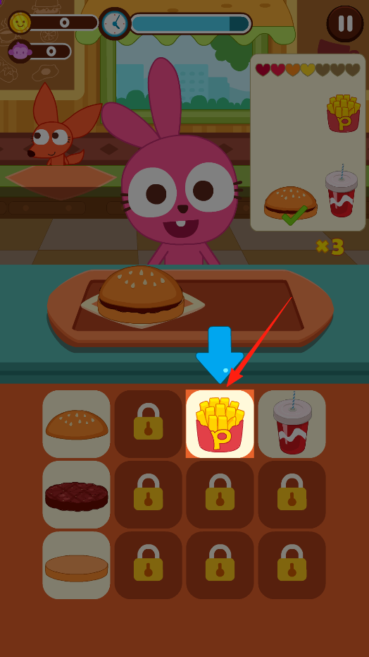 2、已经上了汉堡,接着看右边菜单还缺薯条呢,在下方食材栏找到薯条图标,点击它把薯条放到托盘里,凑齐兔子点的餐,完成这一轮上菜。