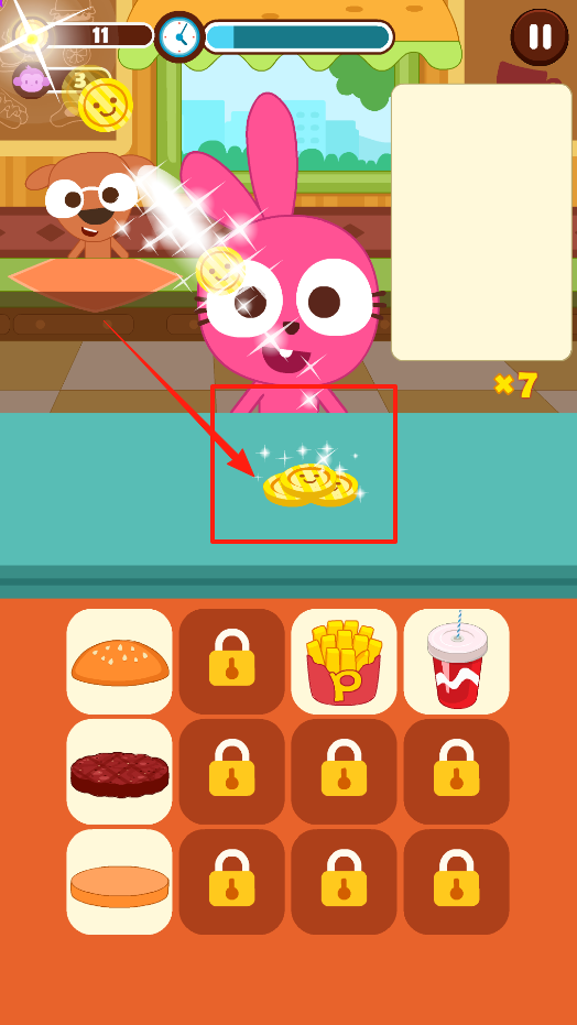 3、餐都上对啦兔子超开心,会给你金币奖励,这些金币会掉在桌上,点击收集起来,金币能用来解锁新食材或者升级餐厅,继续好好服务下一位顾客。