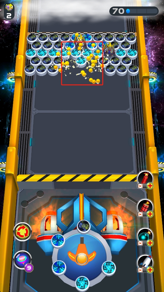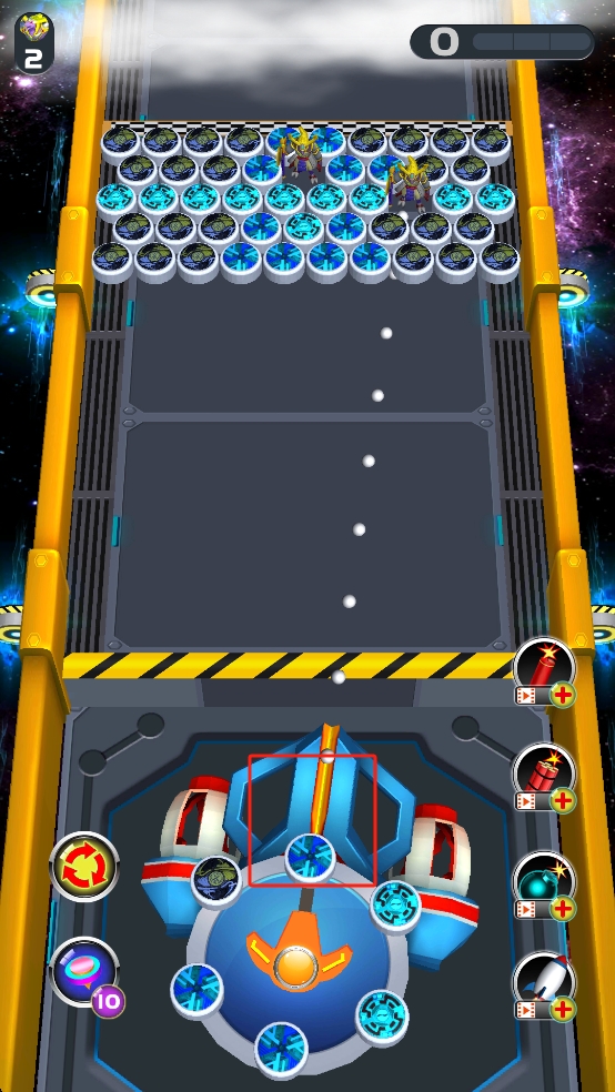 1、在发射界面选定底部弹珠,瞄准上方同色圆球区域点击发射,借弹射消除同色目标,积累分数推进关卡进度。