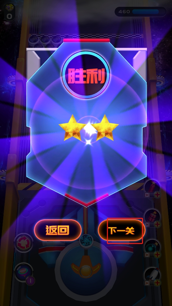 3、关卡胜利后点击屏幕下方的下一关按钮,进入更复杂弹珠消除场景,延续弹射玩法挑战更高难度。