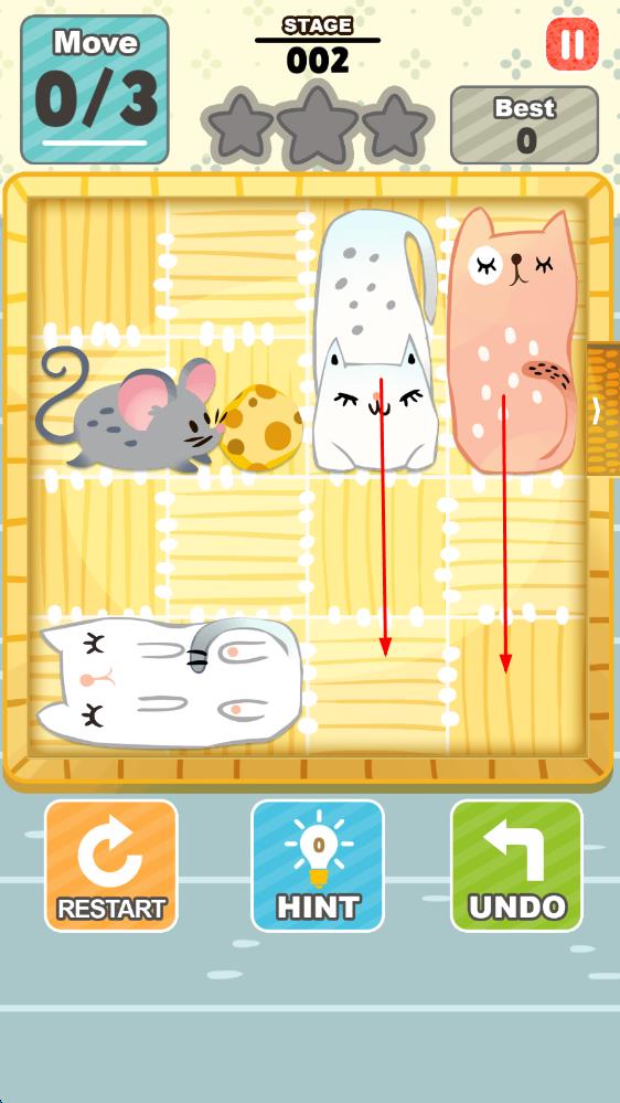2、关卡深入后,猫咪分布更复杂,可使用特殊道具或等待免费提示,在不惊醒猫咪的前提下,逐步破解谜题,帮助小老鼠持续突围。