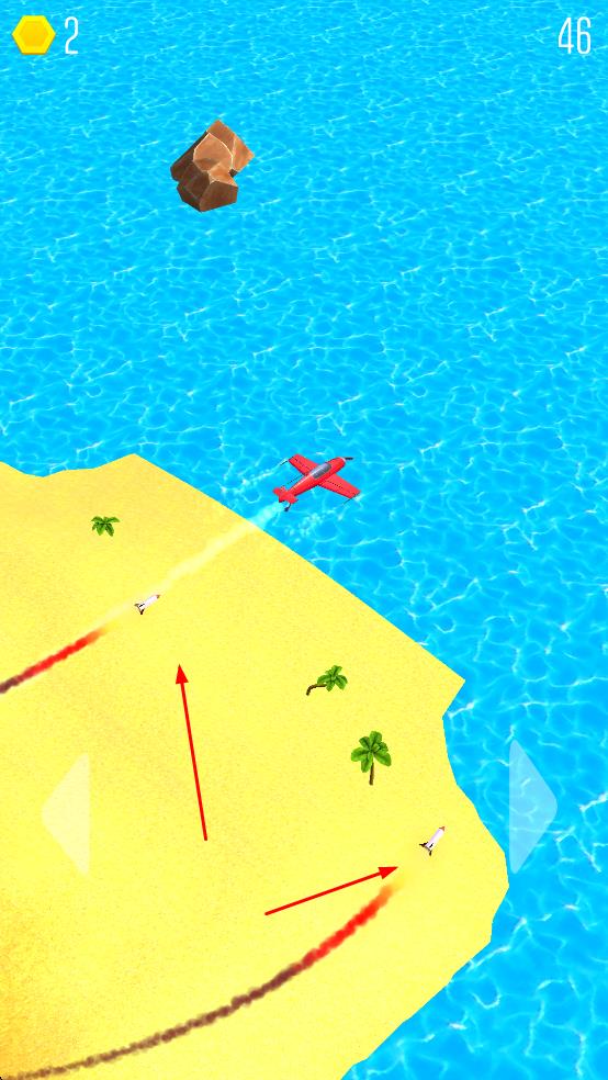 3、飞行至岛屿区域时,借助棕榈树、岩石等地形遮挡导弹,持续收集道具提升分数。
