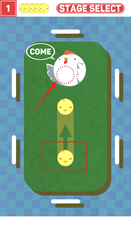 2、进入第一关界面,按照提示,把下方红框里的小鸡往上滑动,送到大鸡身边,完成这关的小鸡归位任务,让大鸡COCK-A-DOODLE-DOO起来。