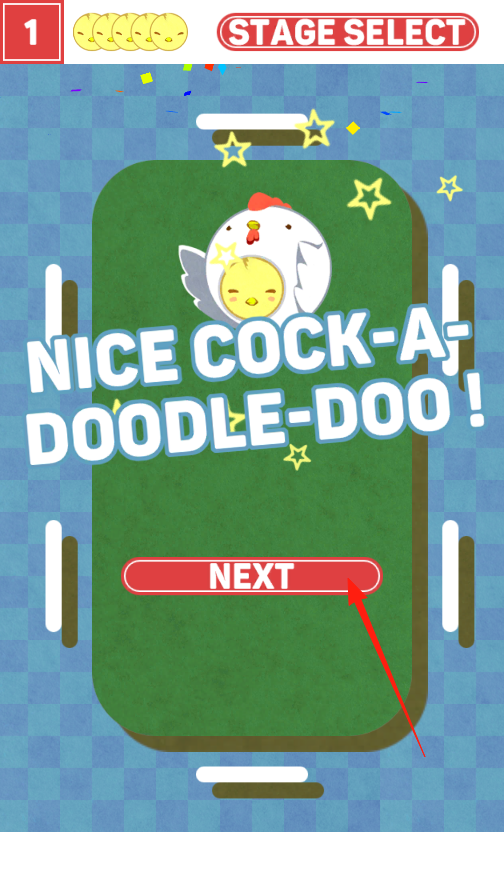 3、成功把小鸡送到大鸡身边后,出现NICE COCK-A-DOODLE-DOO庆祝界面,点NEXT按钮进入下一关,继续挑战新的小鸡归位任务。