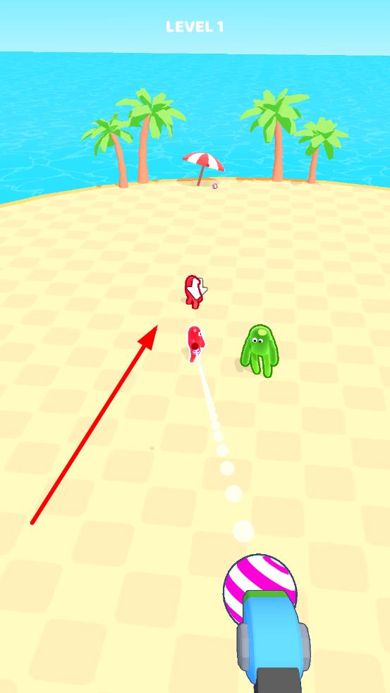1、进入关卡,观察怪物分布、颜色与间距,滑动调整武器角度,准心瞄准同色怪物,并且发射绳索。