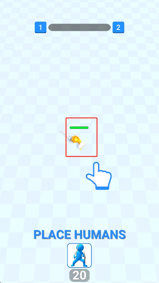 1、在放置界面,拖动底部蓝色士兵,围绕金色英雄布置阵型,合理分配二十个单位,构建攻防布局开启对战。