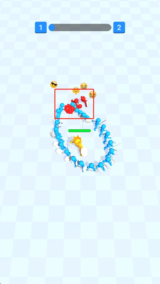 2、战斗阶段,蓝色士兵围击红色敌人,依托数量优势消耗对手血量,保护金色英雄,推进战局直至消灭敌军。
