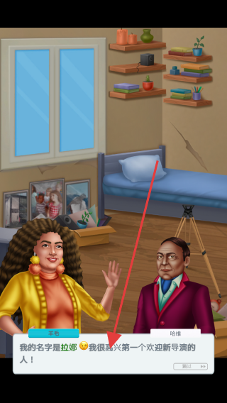1、在游戏剧情对话中,了解角色拉娜的介绍,她是第一个欢迎新导演的人,通过与角色对话推进游戏剧情发展。