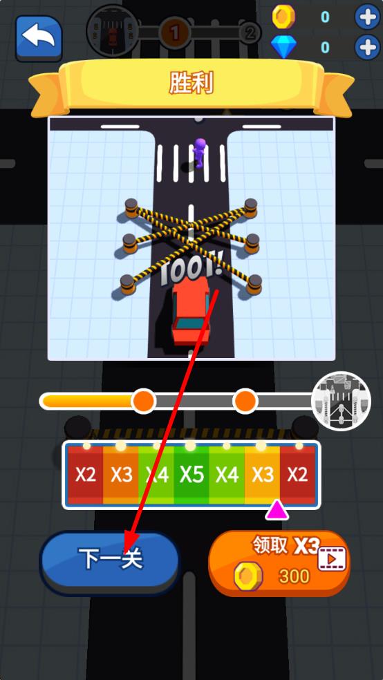 3、阻止车辆冲线后,结算金币与星级;点击下一关,新关卡出现道路分叉、多车并行甚至逆向行驶。