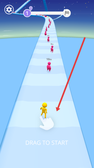 1、拖动黄色角色开启赛跑,在布满粉色对手的跑道上冲刺,尝试超越前方敌人,向终点奋进,开启速度对决。