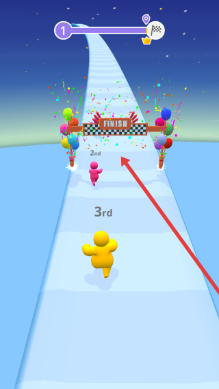 2、比赛结束,粉色角色率先抵达终点,黄色角色位列第三,未能达成率先冲线的目标,结束本轮竞赛。
