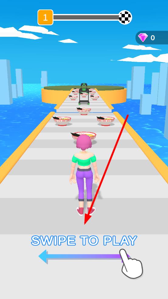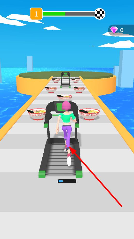 1、滑动屏幕操控角色左右移动,在起始跑道道具群中,挑选跑步机等健身道具,开启策略性闯关进程。