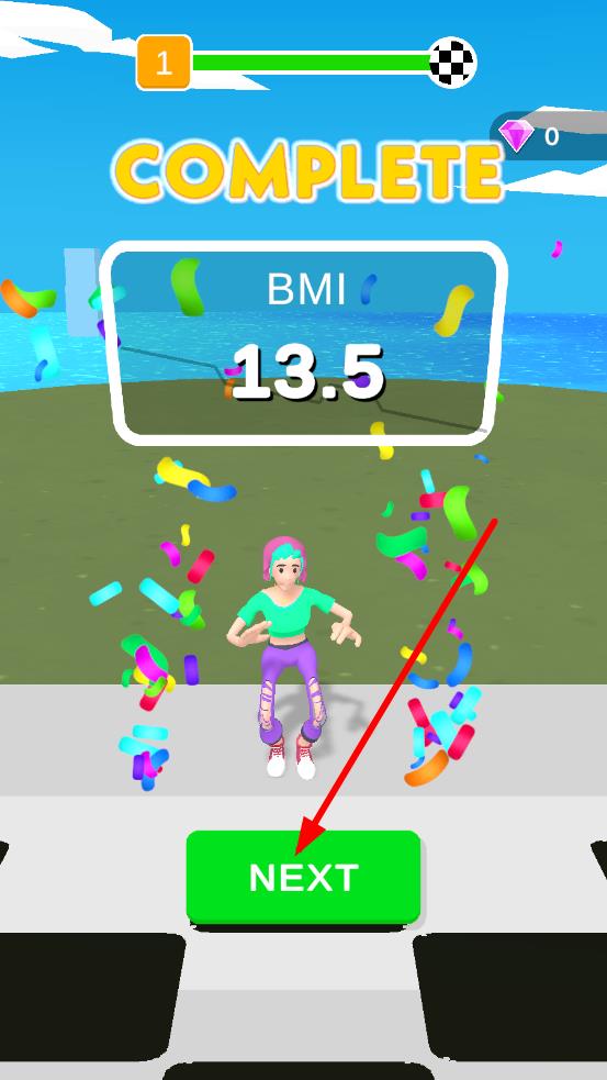 3、抵达终点后,系统依据运动时长、道具收益综合结算BMI数值,以动态特效呈现身材改善成果;点击继续按钮,开启下一关。