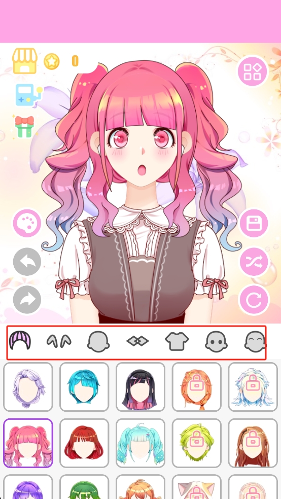 1、进入作品后我们在装扮界面切换底部分类栏,选择发型耳饰等装饰,搭配组合塑造角色独特外观。