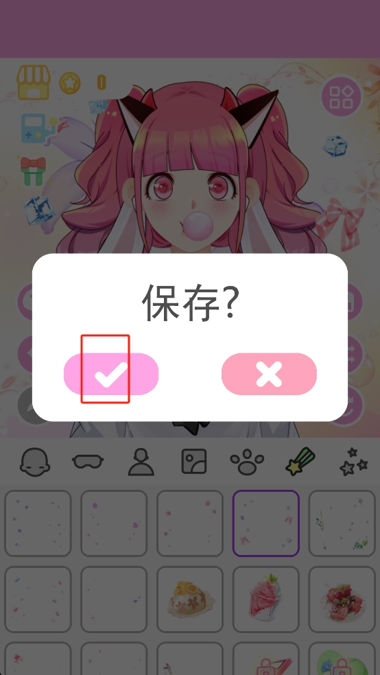 2、装扮完成后会弹出保存提示,这里我们点击左侧粉色对勾按钮,即可保存当前设计的角色形象。
