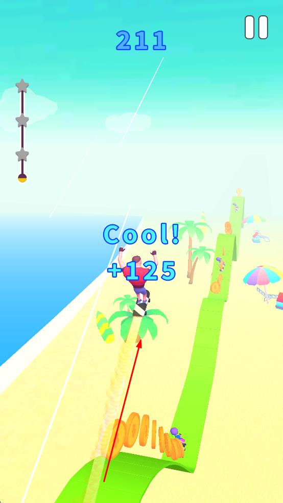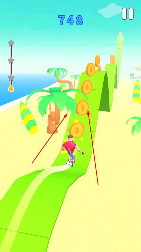 3、持续沿坡道推进收集更多金币,关注左侧星星进度条,达成星级目标解锁新关卡,优化滑板操作提升游戏成绩。