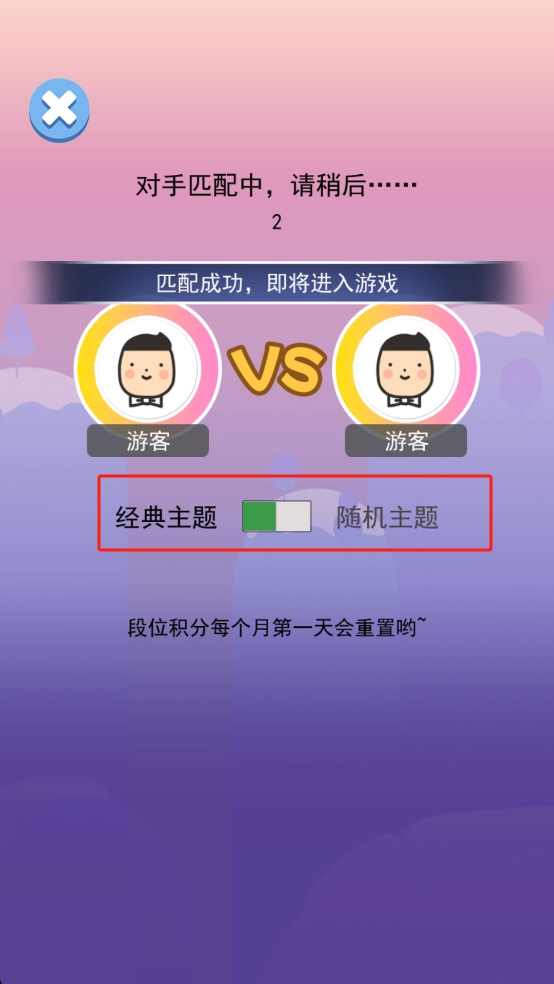1、匹配对手时我们可以选定经典主题或随机主题,等待匹配完成后即可进入水果消除的对战了。