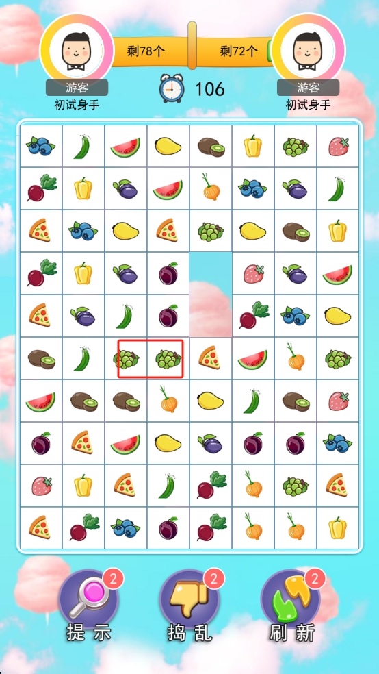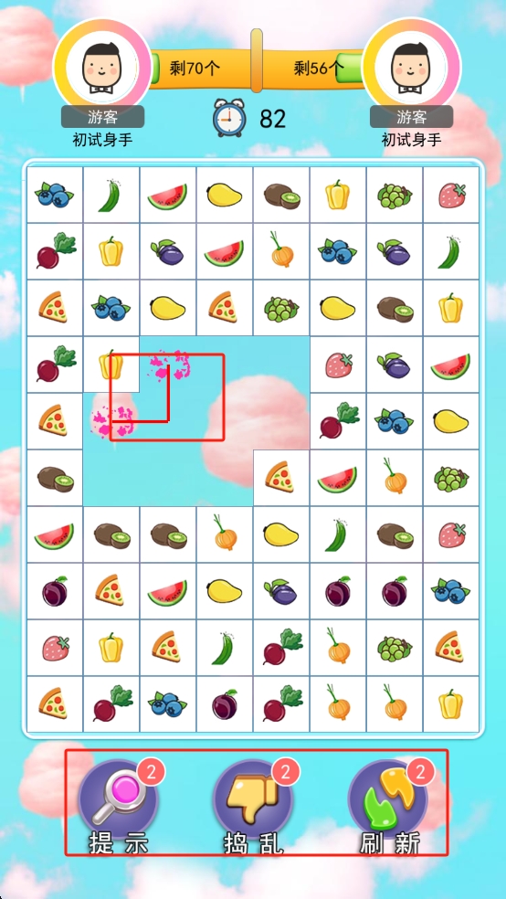 3、若消除受阻,点击底部提示查找可消除组合,用捣乱干扰对手,或刷新重置布局,合理运用技能优化消除策略。