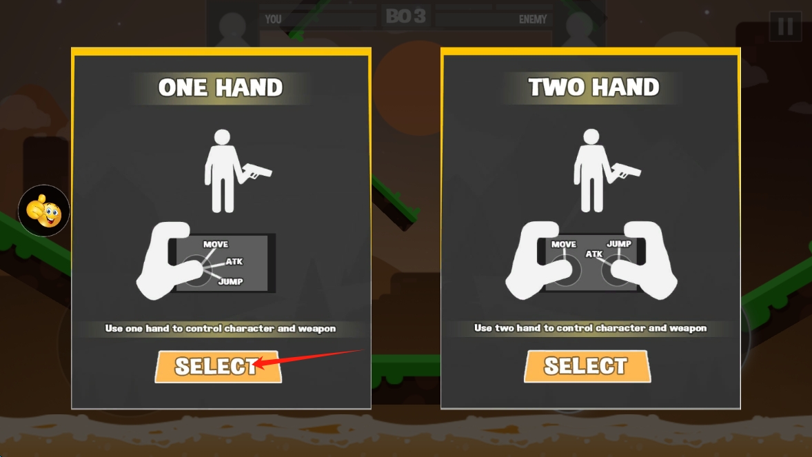 1、在操作模式选择界面,根据自身习惯,选择ONE-HAND或TWO-HAND模式,点击SELECT,确定操作方式。