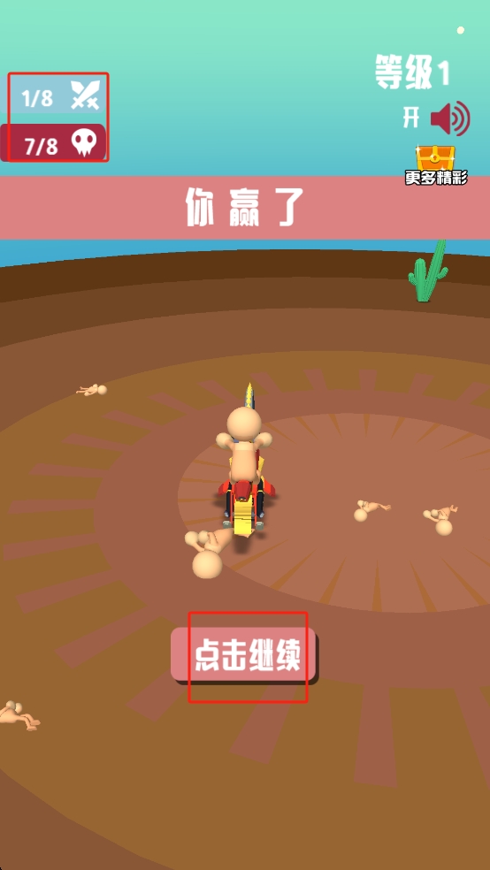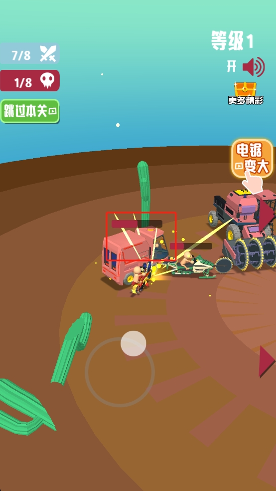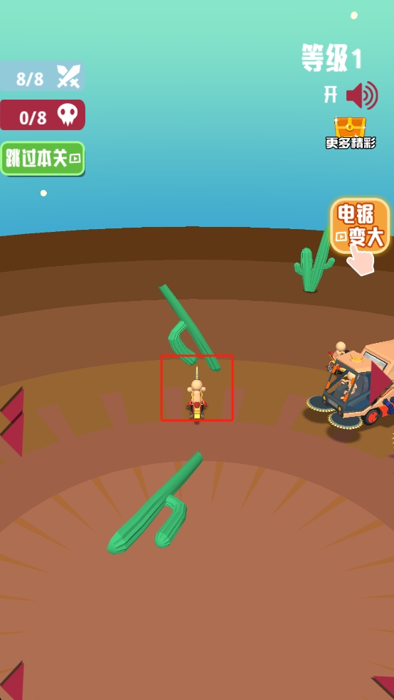 1、操控摩托角色在沙漠场景行动,留意周围仙人掌障碍,通过击杀不断变大,向敌方单位发起进攻。