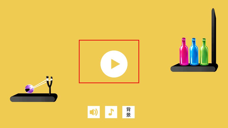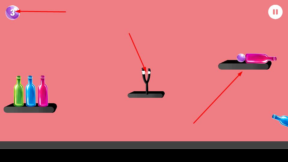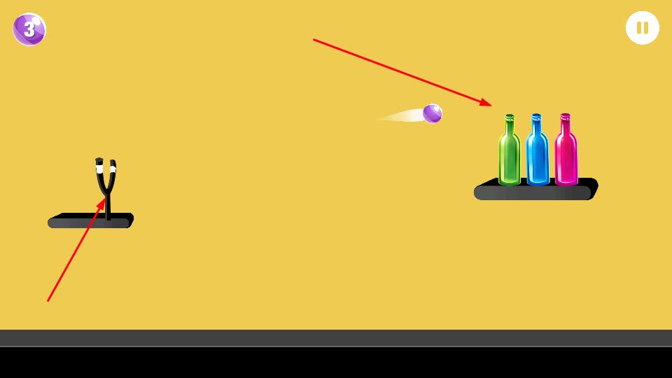 2、游戏中操控左侧弹弓,瞄准彩色瓶子发射紫色弹丸,留意左上角弹丸剩余数量如数字3,规划射击步骤。