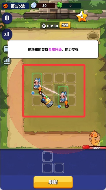 1、开局选择英雄与图腾神鸡,根据敌方怪物属性,合理布置英雄站位与防御塔,确保每波来袭的怪物精准被击退。