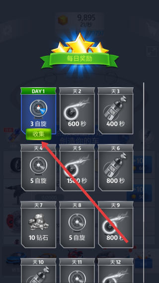 1、进入每日奖励界面,点击DAY1的收集按钮,获取3自旋奖励,为车辆打造积累初始资源。