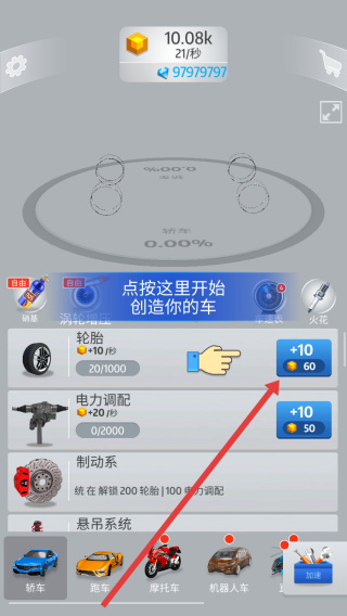 2、在创造车辆界面,点击轮胎右侧标有+10的蓝色按钮,消耗60金币提升轮胎属性,推进造车进程。