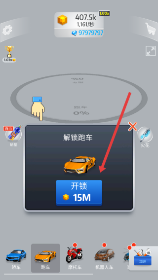 3、想要解锁跑车时,点击弹窗内标有15M金币的开锁按钮,消耗金币获取橙色跑车,丰富车辆收藏。