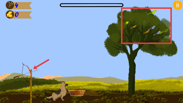 2、利用弓箭瞄准树上的鸟,找准时机发射,按住屏幕拉弓,松开手后,箭就会发射出去,尝试击中目标。