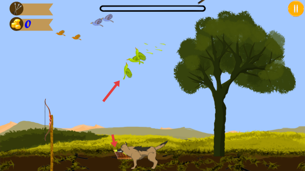 3、成功击中鸟后,它们会掉落,此时狗去拾取掉落的鸟,收到我们的篮子里面,获取相应的收益。