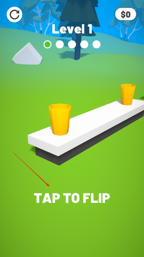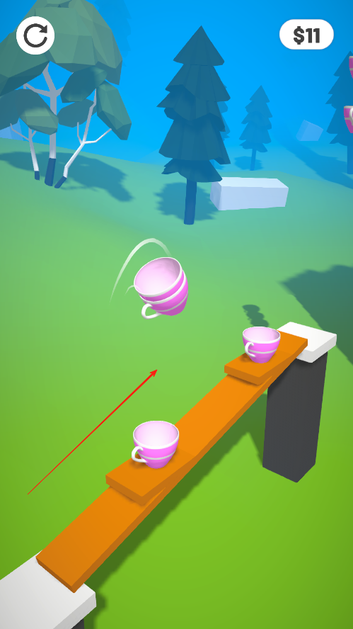 1、点击屏幕可以控制纸杯旋转跳跃,使纸杯落在另一个纸杯上,成功让纸杯摞起来即可。