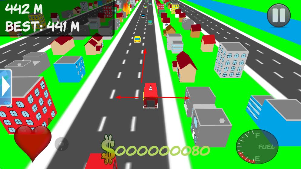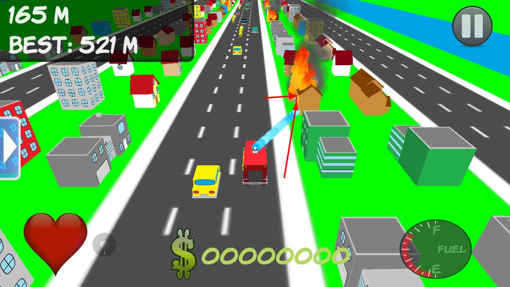 1、操控消防车在城市道路行驶,留意左上角行驶距离与最佳成绩,收集金币,同时关注燃料状态,确保顺利推进救援进程。