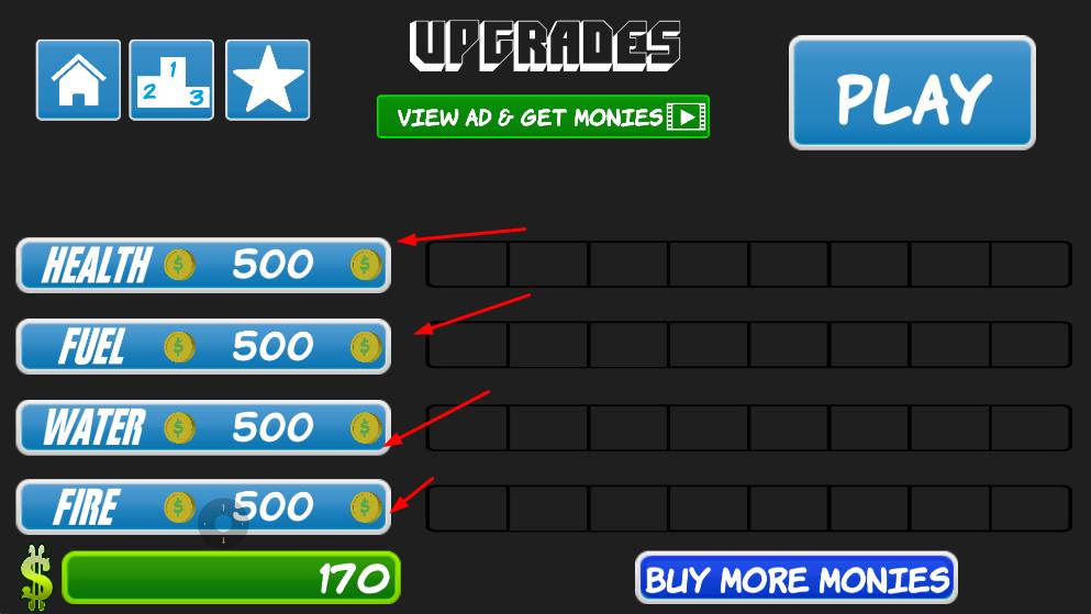 2、在升级界面,消耗金币升级健康、燃料、储水量、灭火效能等属性,提升消防车性能,为高效救援奠定基础。
