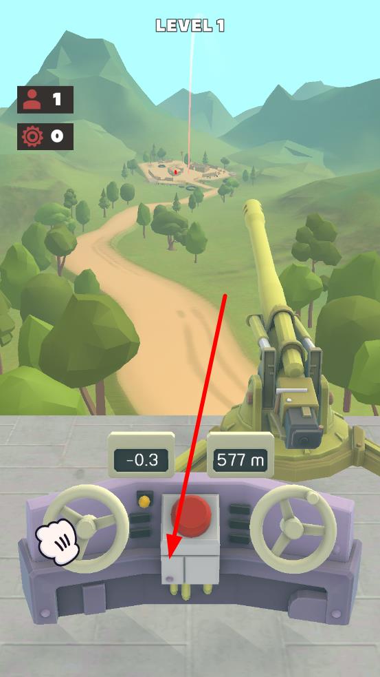 1、进入关卡后,滑动屏幕左右调节炮台角度,观察显示的距离参数与角度数值,点击红色发射按钮,射出炮弹。