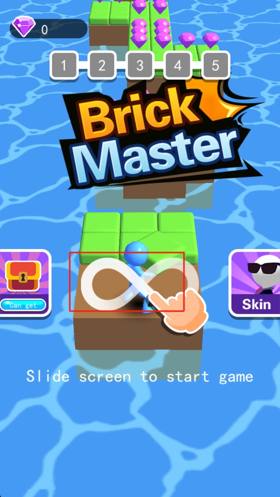 1、滑动屏幕启动游戏,操控蓝色小人进入关卡,开启收集紫色宝石、堆叠绿色砖块以搭建路径的挑战。