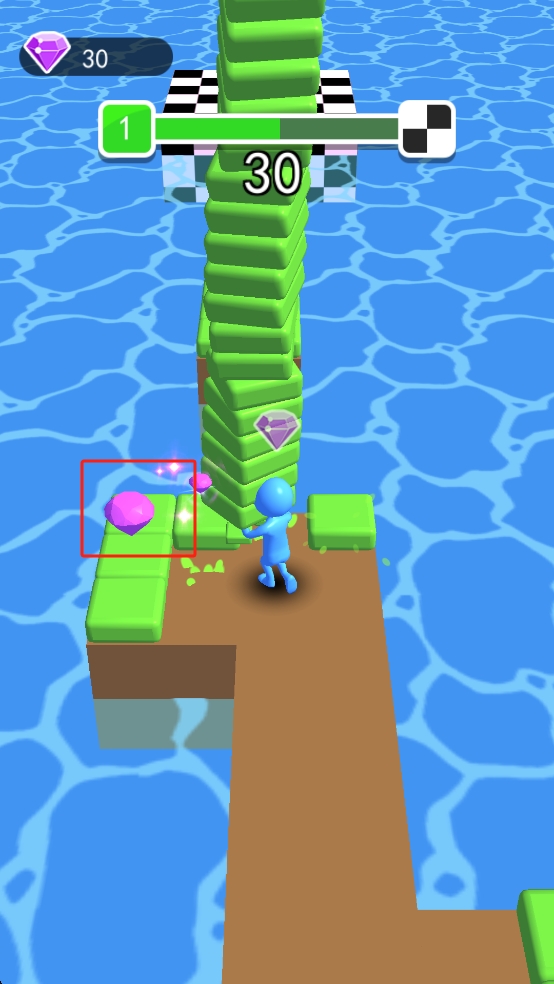 2、游玩中引导小人移动,收集散落的紫色宝石,堆叠绿色砖块构建向上通道,保持平衡避免落水。