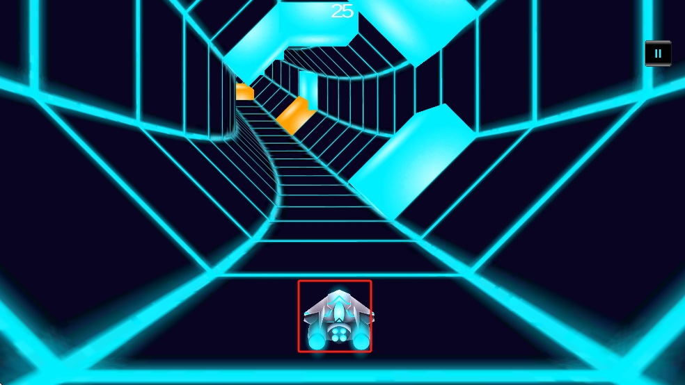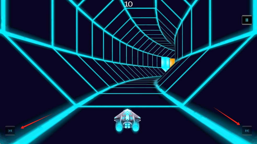 1、点击左右箭头按钮,操控飞船在霓虹隧道内左右位移,闪避蓝黄几何障碍,持续飞行积累分数。