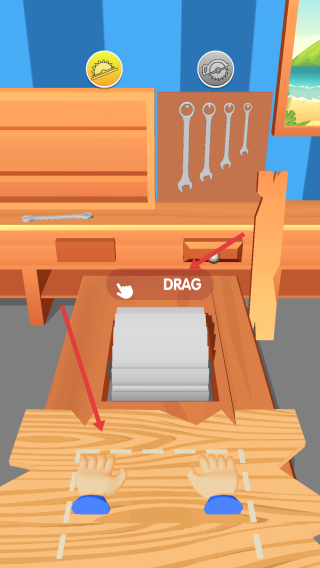 1、在游戏中,按照提示拖动木板,将其放置在合适的位置上,开始进行木工操作。