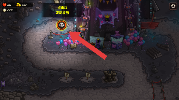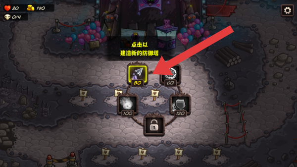 2、目前处于敌人进攻前的场景,可以点击箭头所指向的区域进行建造新的防御塔,以防时刻准备攻击过来的敌人。