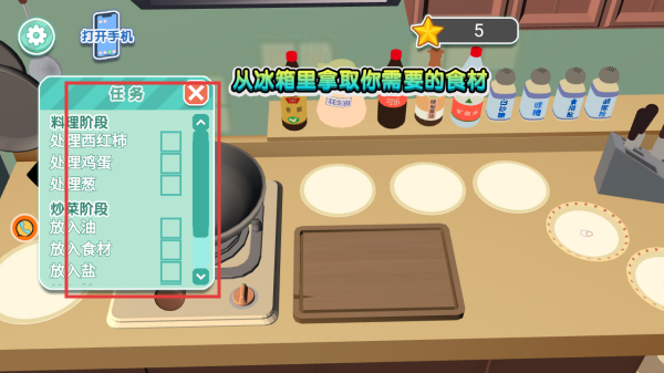 3、在烹饪过程中,根据任务列表的要求,从冰箱中拿取所需食材,按照处理食材、炒菜等阶段的步骤进行操作,完成烹饪任务,提升烹饪技能。
