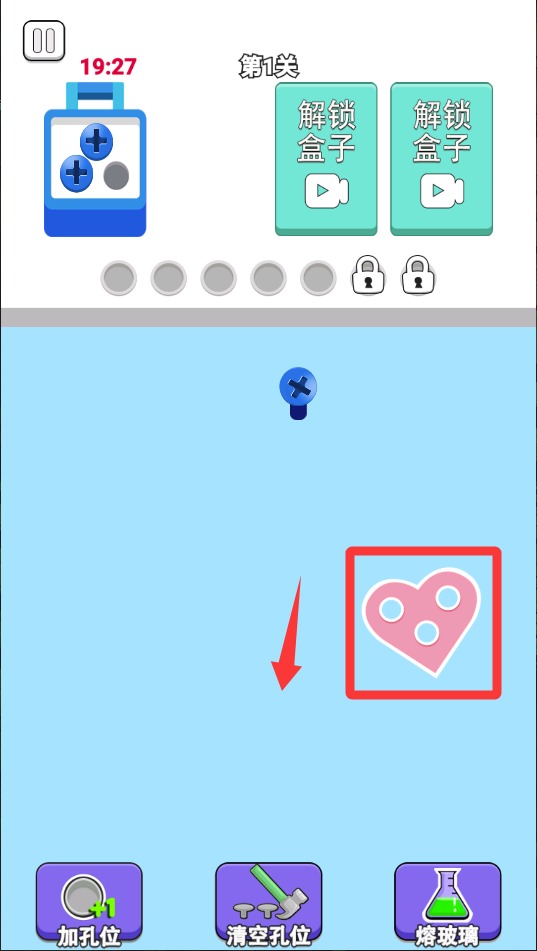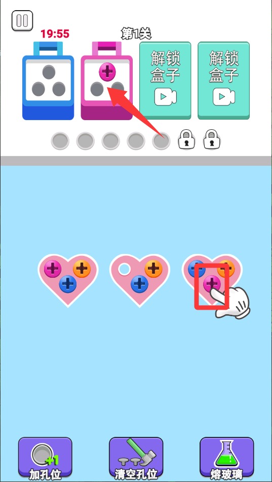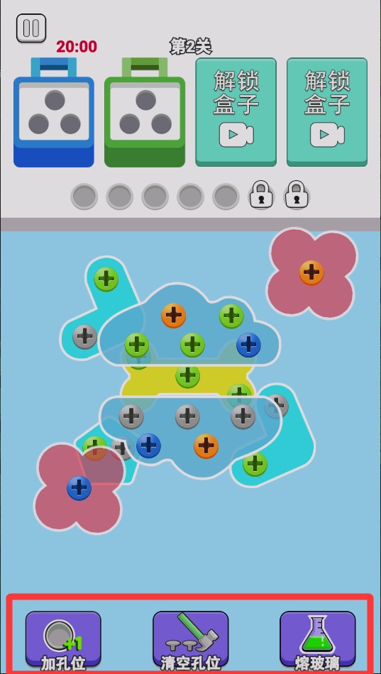 1、开局先点击屏幕拾取螺丝,将三个同色螺丝拖到相邻位置即可消除,注意优先清理底部障碍为后续操作铺路。