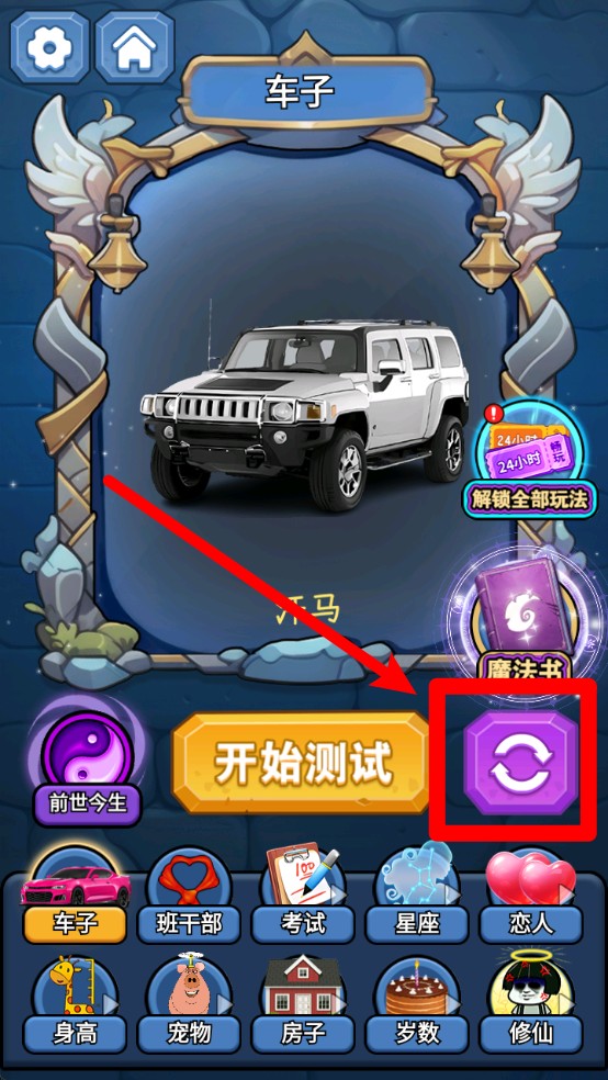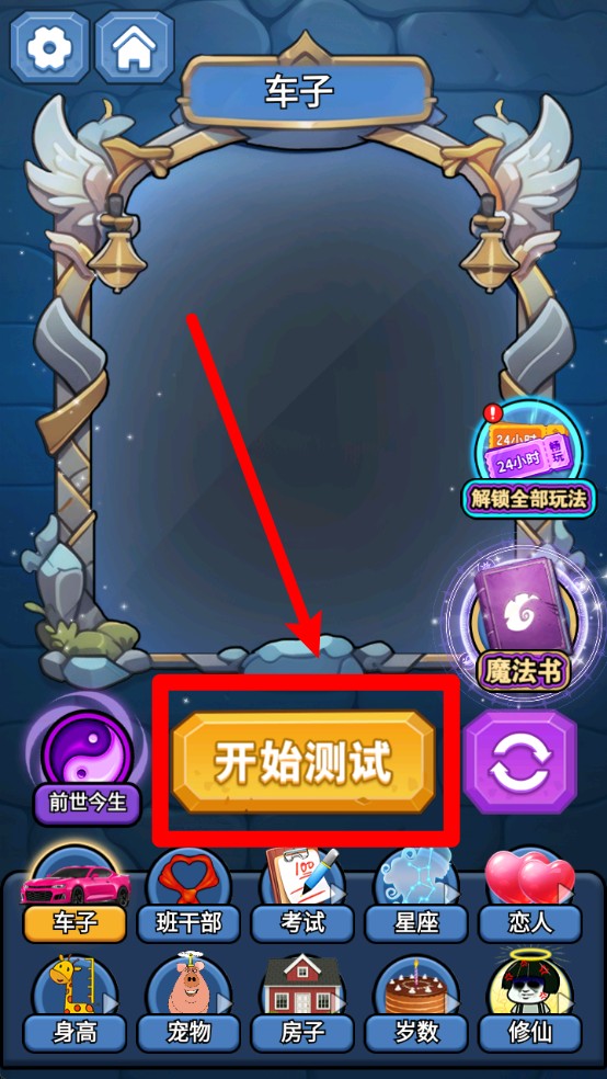 1.点击“开始测试”按钮可立即进行魔镜占卜,支持从底部分类中选择测试主题,如车子、星座或考试等项目内容。