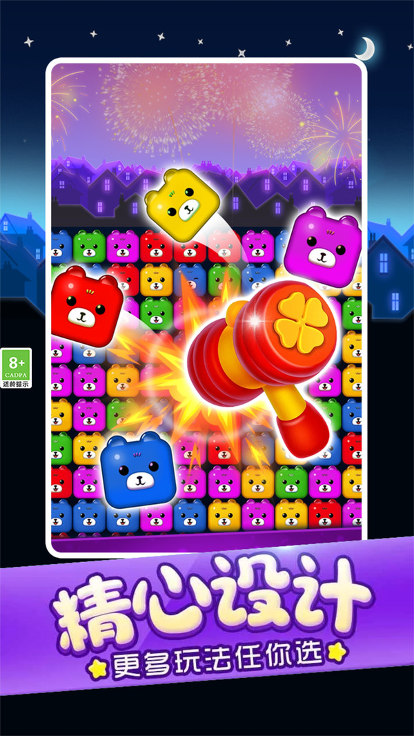 1.可爱方块设定:以超萌熊熊形象打造的方块设计,整体画风清新温暖,视觉治愈力满分,瞬间激起玩家的收集欲望与操作兴趣。