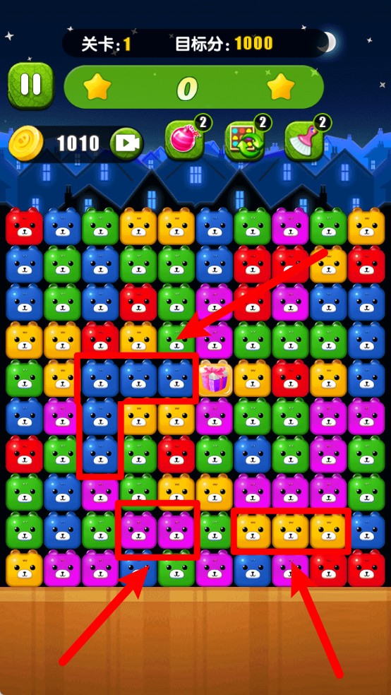 1.点击同色熊熊:连接两个以上相同颜色的方块即可消除,路径可折线,只要连得起来就能得高分。
