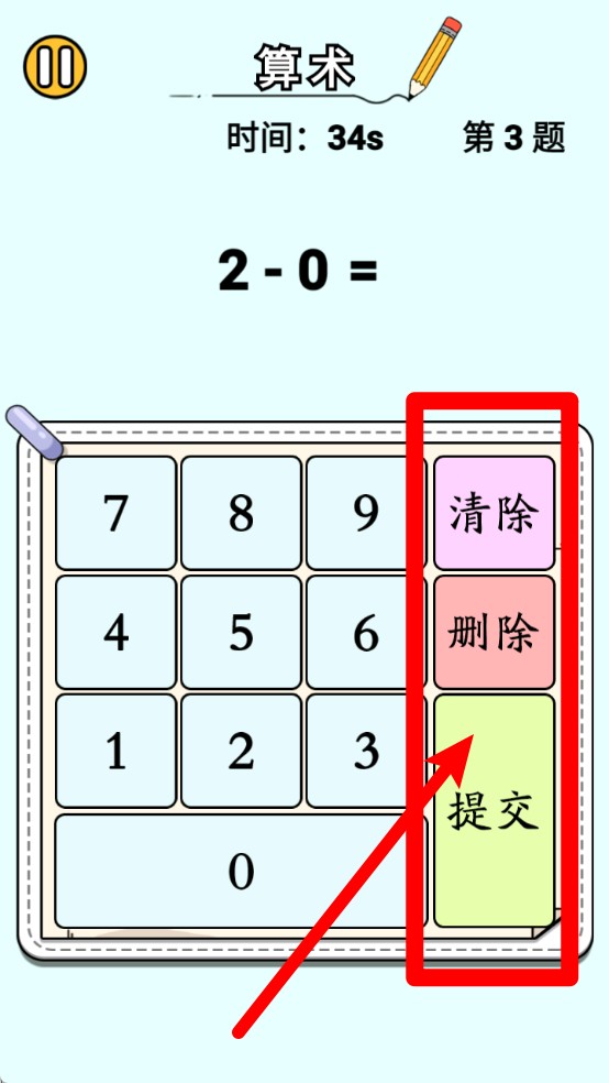 2.答题互动区域:通过数字键盘输入答案,再点击“提交”完成作答,同时支持清除或删除操作调整。