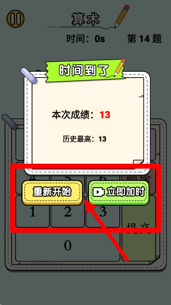 3.结算功能提示:时间结束时显示当前成绩,并可选择“重新开始”或“立即加时”继续答题闯分数。