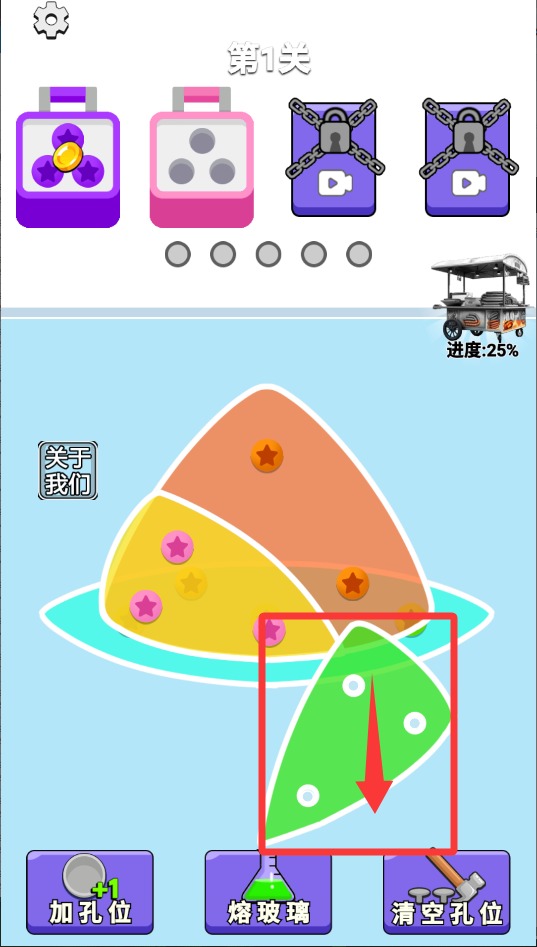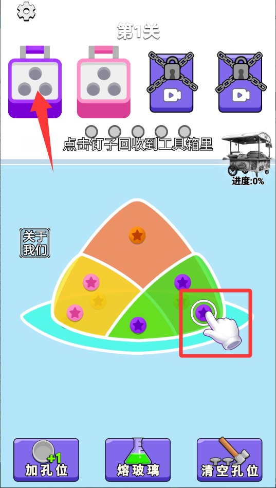 2、优先处理画面中三个相连的金属钉,通过拖拽方式将它们同时消除,这是解开机关的基础操作技巧。
